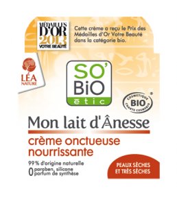 Puis je passe ma nouvelle crème hydratante au lait d’ânesse bio So bio Etic, achetée chez E.Leclerc à 9€. Pour mémoire, une gamme identique « chemins du soin » existe chez Auchan.